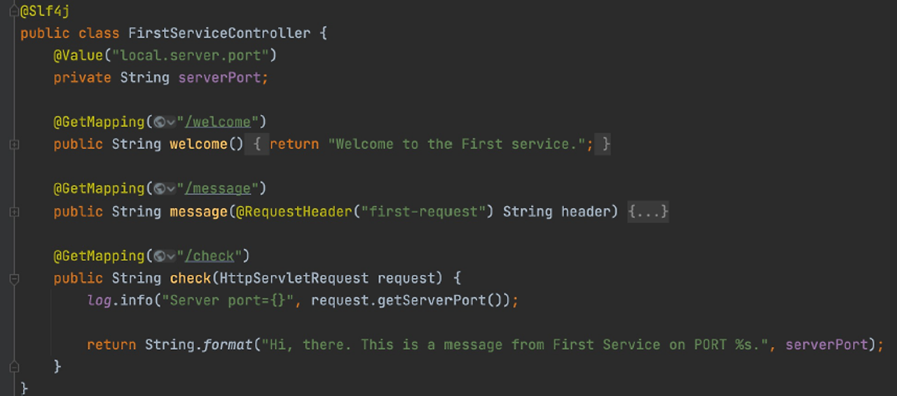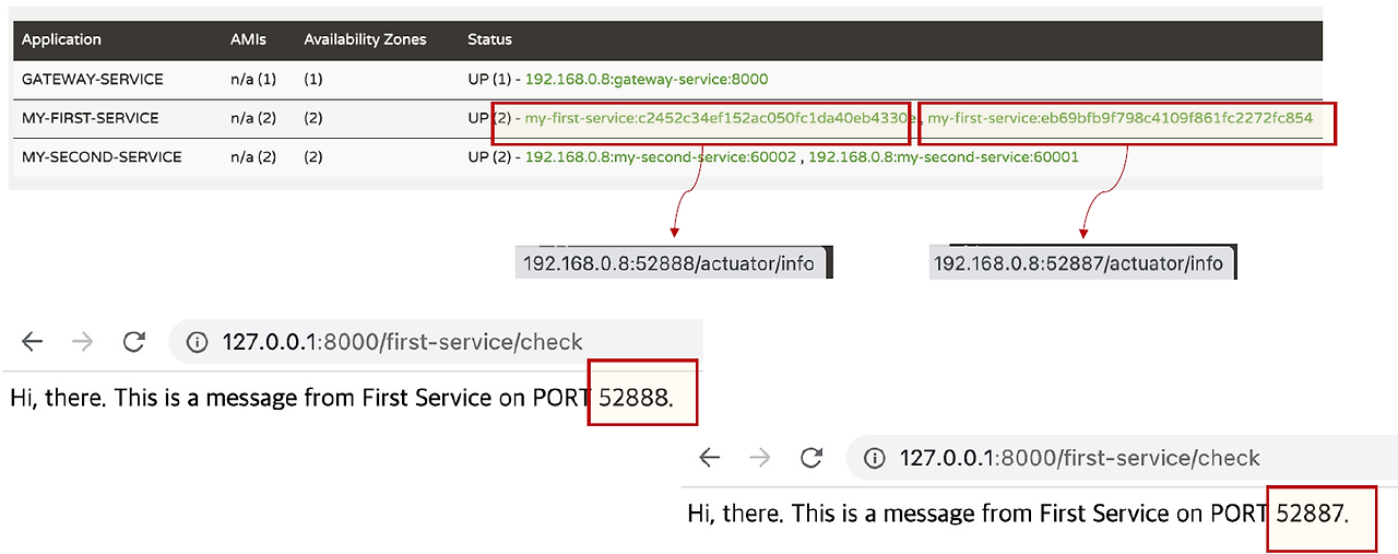 → 예를 들어, my-first-service라는 마이크로서비스를 각각 8081, 9091의 포트번호를 갖는 2개의 서버로 기동했다고 생각해보자. 클라이언트의 요청이 들어왔을 때, lb는 8081 혹은 9091 중 하나로 포워딩을 해주는 역할을 한다.