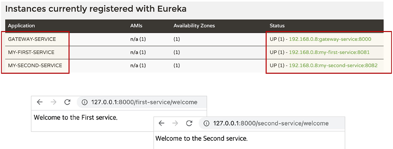 - Eureka라는 Naming 서비스에 Spring Cloud Gateway를 등록하고 first service, second service를 등록