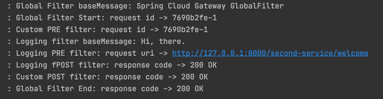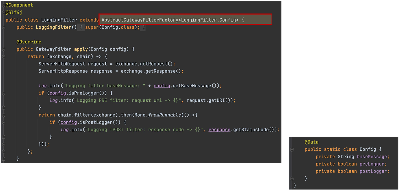 → filter라는 메소드가 재정의됨으로써 필터가 해야 할 역할을 지정 가능 GatewayFilterChain은 다양한 필터(pre filter, post filter, pre chain, post chain) 등을 연결시켜 작업할 수 있게 도와줌