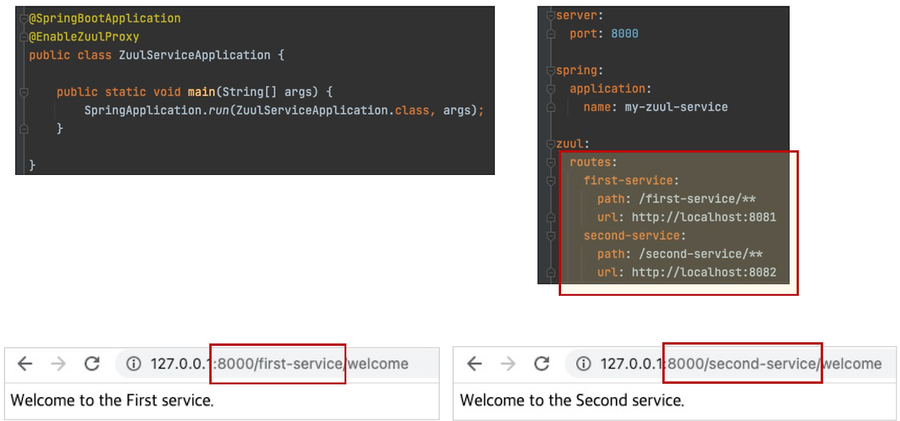 - 클라이언트에서는 Netflix Zuul에 데이터 요청을 하게 되면 Netflix Zuul이 그 요청을 First Service 혹은 Second Service로 보내주는 역할