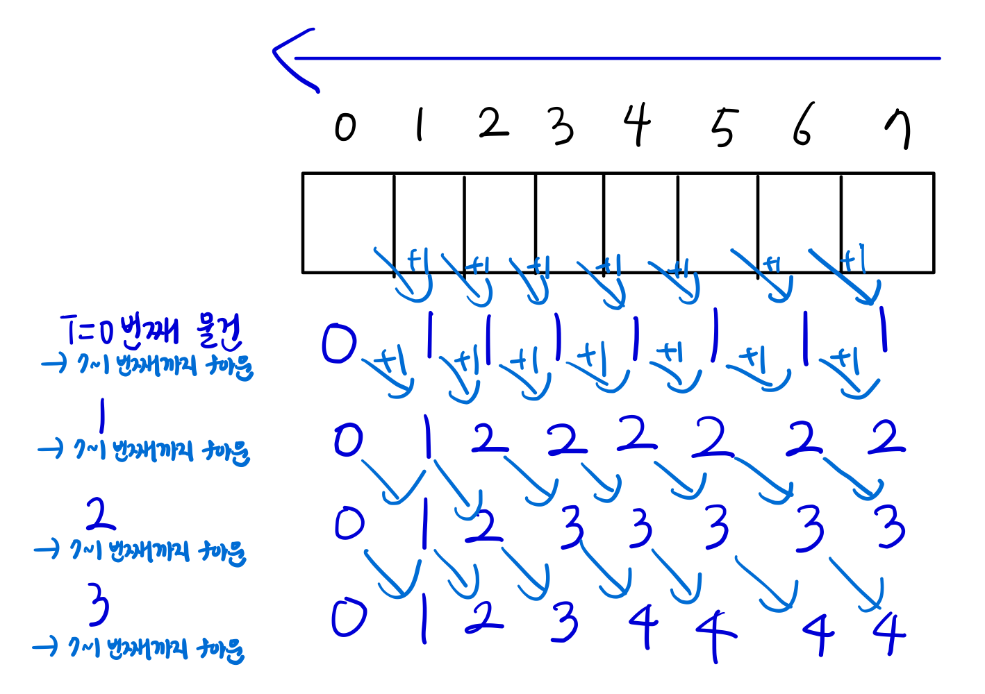 - 그리고 w[i] - 1까지만 for문을 반복하므로 물건을 한번만 넣는다는 것이 보장된다. (하나의 물건을 여러번 넣어서 겹치지 X)
