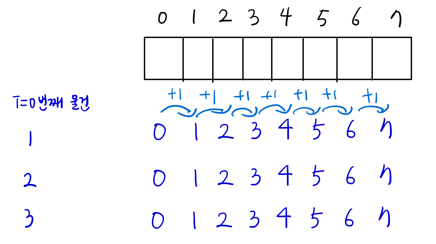 [0, 1, 1, 1, 1, 1, 1, 1] -> 설명 : 1번째 물건을 넣었거나 넣지 않았을 때의 각 무게 한도 내에서의 최대 가치의 합