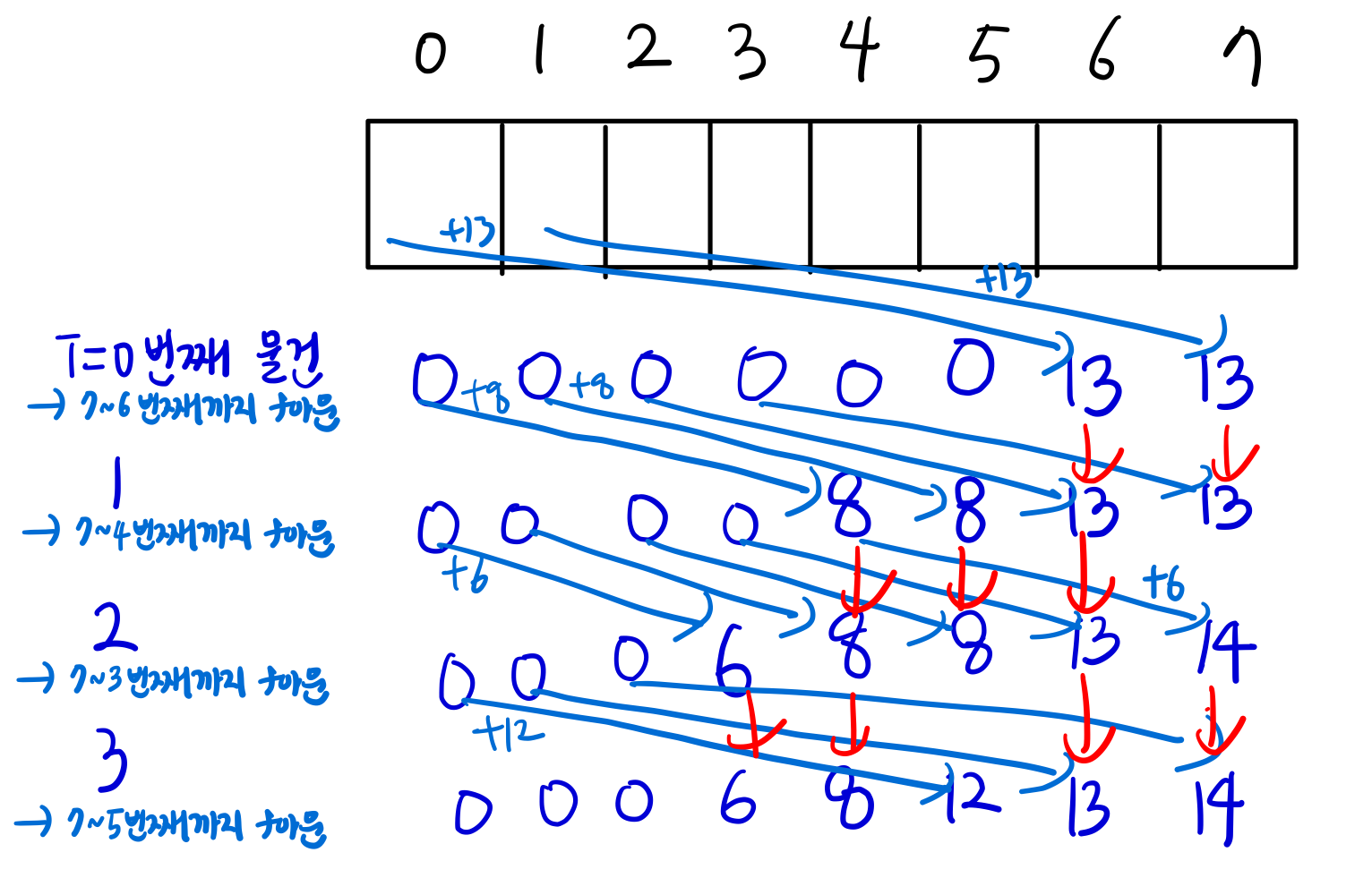[0, 1, 2, 2, 2, 2, 2, 2] > 설명 : 2번째 물건을 넣었거나 넣지 않았을 때의 각 무게 한도 내에서의 최대 가치의 합