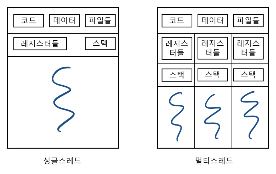 -멀티 스레드 : 같은 프로세스 안에 들어 있으면서 메모리 리소스를 공유하게 되므로 효율적인 처리가 가능하다. 동시에 리소스를 접근할 경우 데드락(교착 상태)이 발생하게 된다.