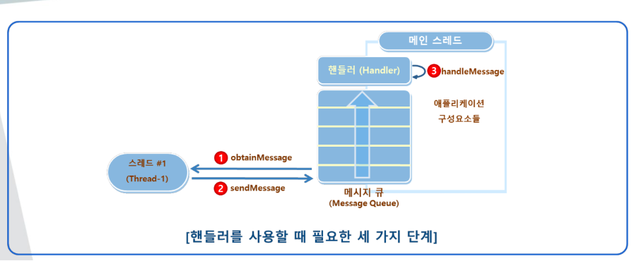 -> 스레드에서 obtainMessage() 함수를 통해서 메시지 객체를 받아온 후에 sendMessage() 함수를 통해서 메시지 큐에 메시지를 보낸다. 그 후 핸들러로 메시지를 보낸 후에 handleMessage() 함수를 사용하여 메인 스레드에서 메시지를 처리한다.