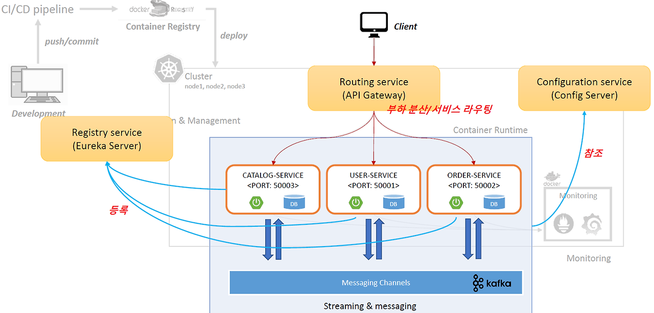 - 외부에서 클라이언트 요청이 들어왔을 때 Spring API Gateway를 이용하여 라우팅 서비스 / 부하 분산