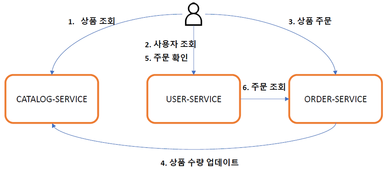 - 사용자가 상품 주문하면 ORDER-SERVICE가 CATALOG-SERVICE의 상품 수량 업데이트