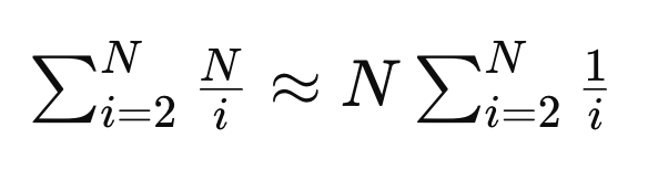 전체 시간 복잡도는 아래와 같다. 이는 조화급수로 로그에 수렴하므로, 전체 시간 복잡도는 O(NlogN)이 된다.
