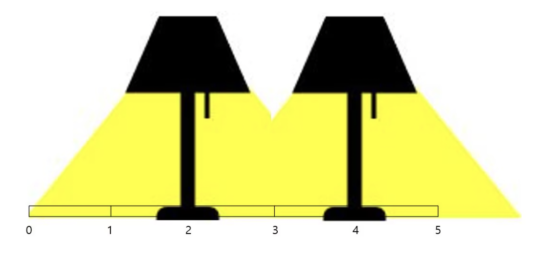 - 가로등-가로등 사이의 간격을 2로 나눈값을 올림해준다. 2로 나눠주는 이유는 왼쪽의 가로등과 오른쪽의 가로등이 반반 나눠 길을 비출 수 있기 때문이다.