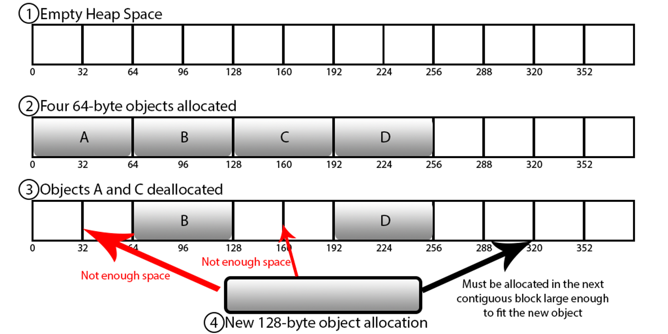 - RAM에서 메모리를 할당하고 해제하는 과정에서 작은 빈 공간이 발생할 수 있다. 이로 인해 새로운 메모리를 할당할 때, 사용 가능한 메모리의 총량은 충분하지만, 할당하려는 크기에 맞는 연속된 공간이 부족하게 된다. 결국 메모리는 조각화되어 비효율적으로 사용되고, 이로 인해 새로운 메모리는 주로 메모리의 끝부분에 할당되면서 메모리 낭비가 심해진다.