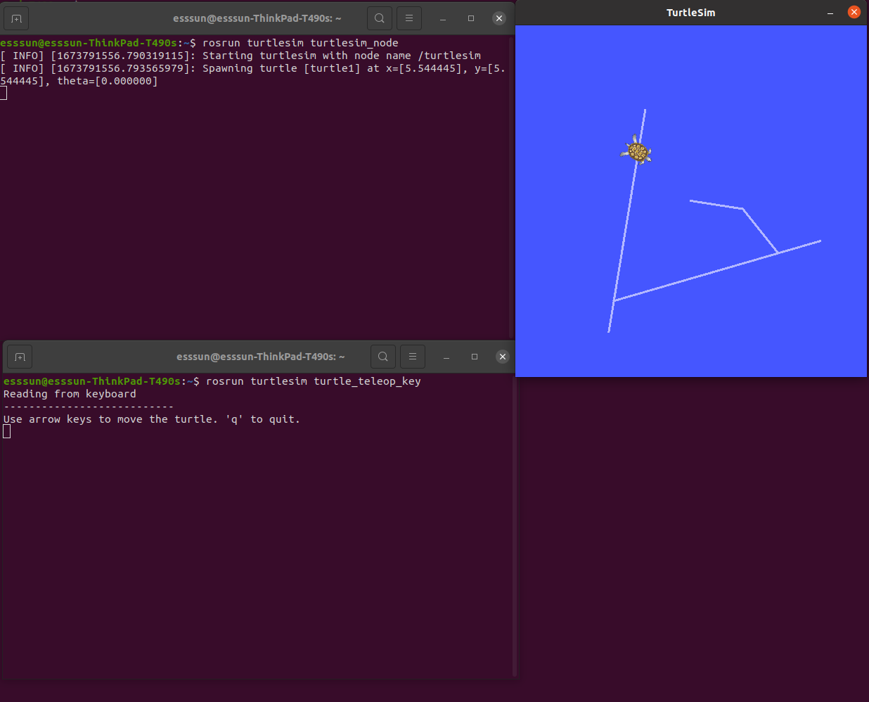 두번째 명령어(rosrun turtlesim turtle_teleop_key)를 친 터미널에 마우스를 클릭하여 활성화시켜준 다음, 방향키 ←→↑↓를 눌러주면, 다음과 같이 내가 입력을 준 방향대로 거북이가 움직이는 것을 볼 수 있다.