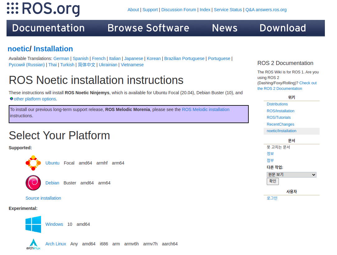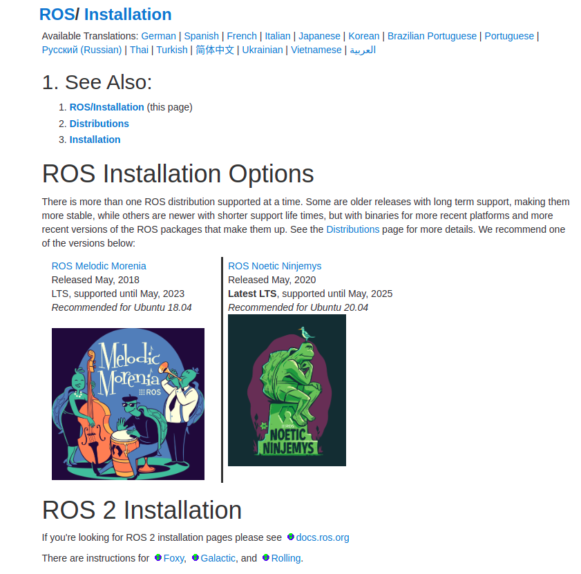 wiki.ros.org 홈페이지에 들어가서 Documentation 카테고리에 들어간다. 그 다음 installation을 눌러 최신 버전의 LTS로 설치해준다.