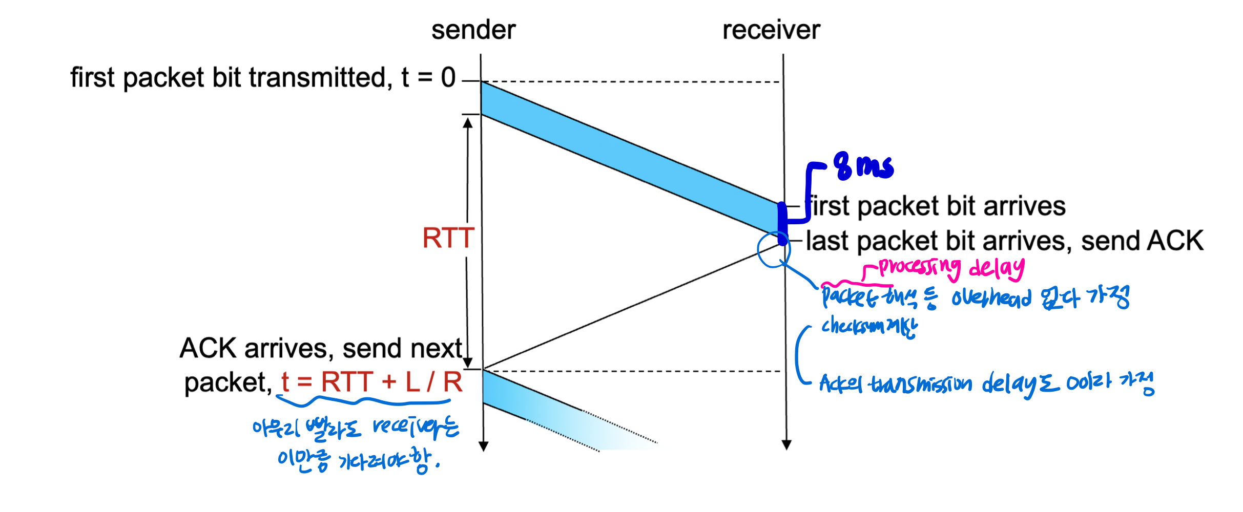- packet을 보낸 후, receiver로부터 ACK를 받아야하므로 RTT = 15ms *2 = 30msec - ACK의 transmission rate은 여기서 없다고 가정.