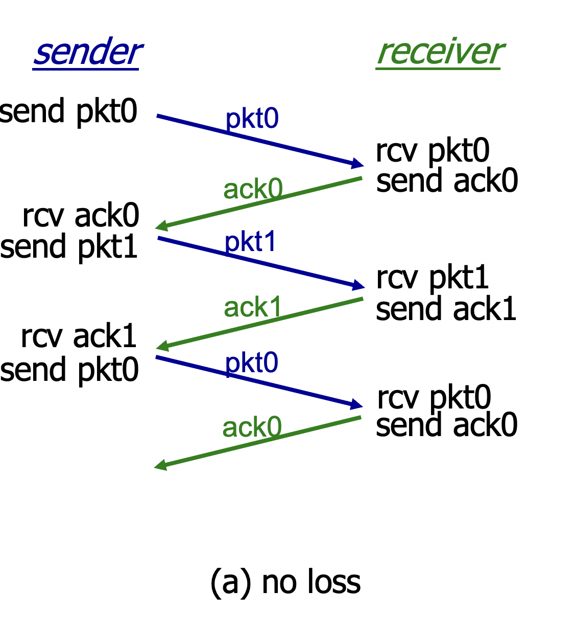 stop and wait : sender가 packet 하나를 보내고, receiver로부터 응답(ACKs/NAKs)을 받을때까지 기다림. 즉, receiver가 응답을 보내줄때까지 sender가 그 다음 packet을 보내지 않고 기다림