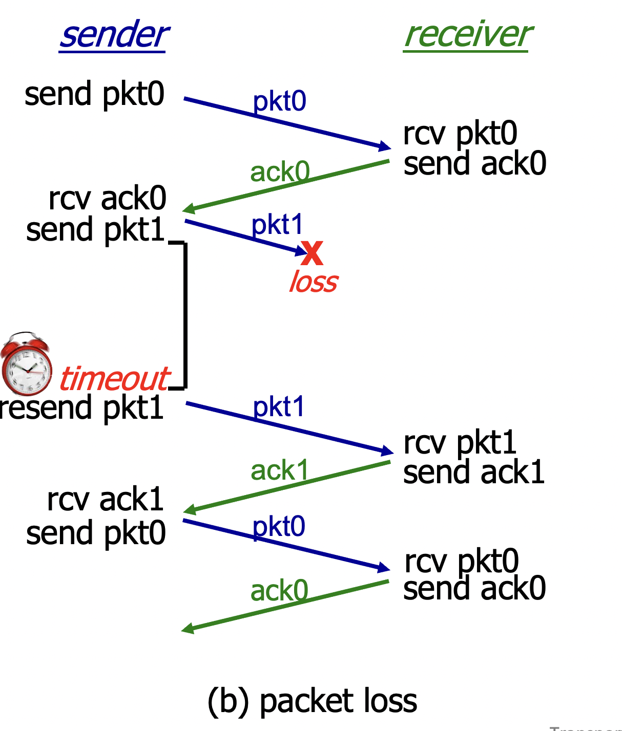 - sender 입장에선 pkt1 loss/ACK1 loss/ACK가 오고있는지 알 수 없기 때문에 일정 시간이 지나면 재전송