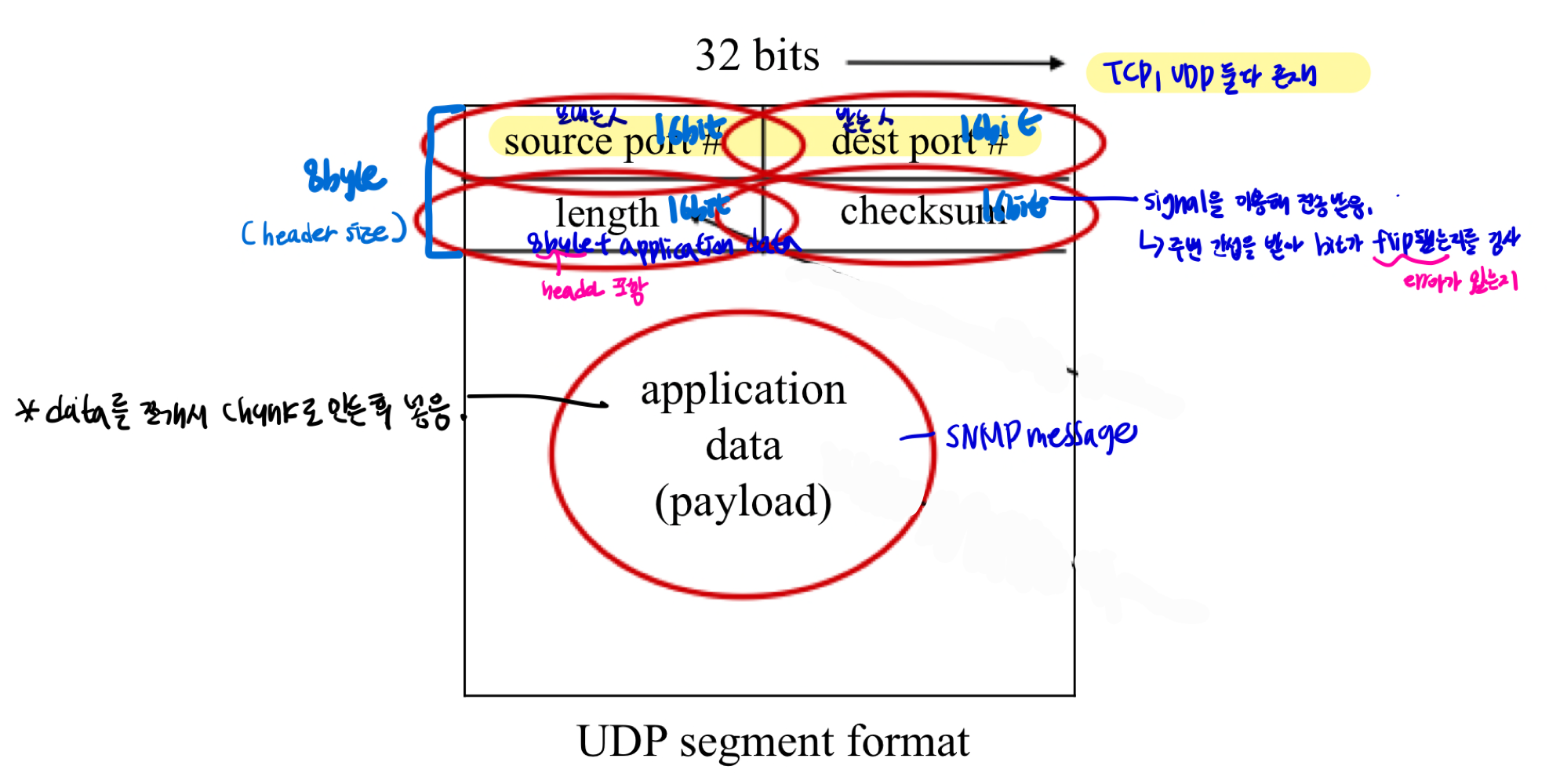 demultiplexing as receiver : 해당 segment를 받을 소켓에게 올바르게 전달하기 위해 헤더 정보 이용