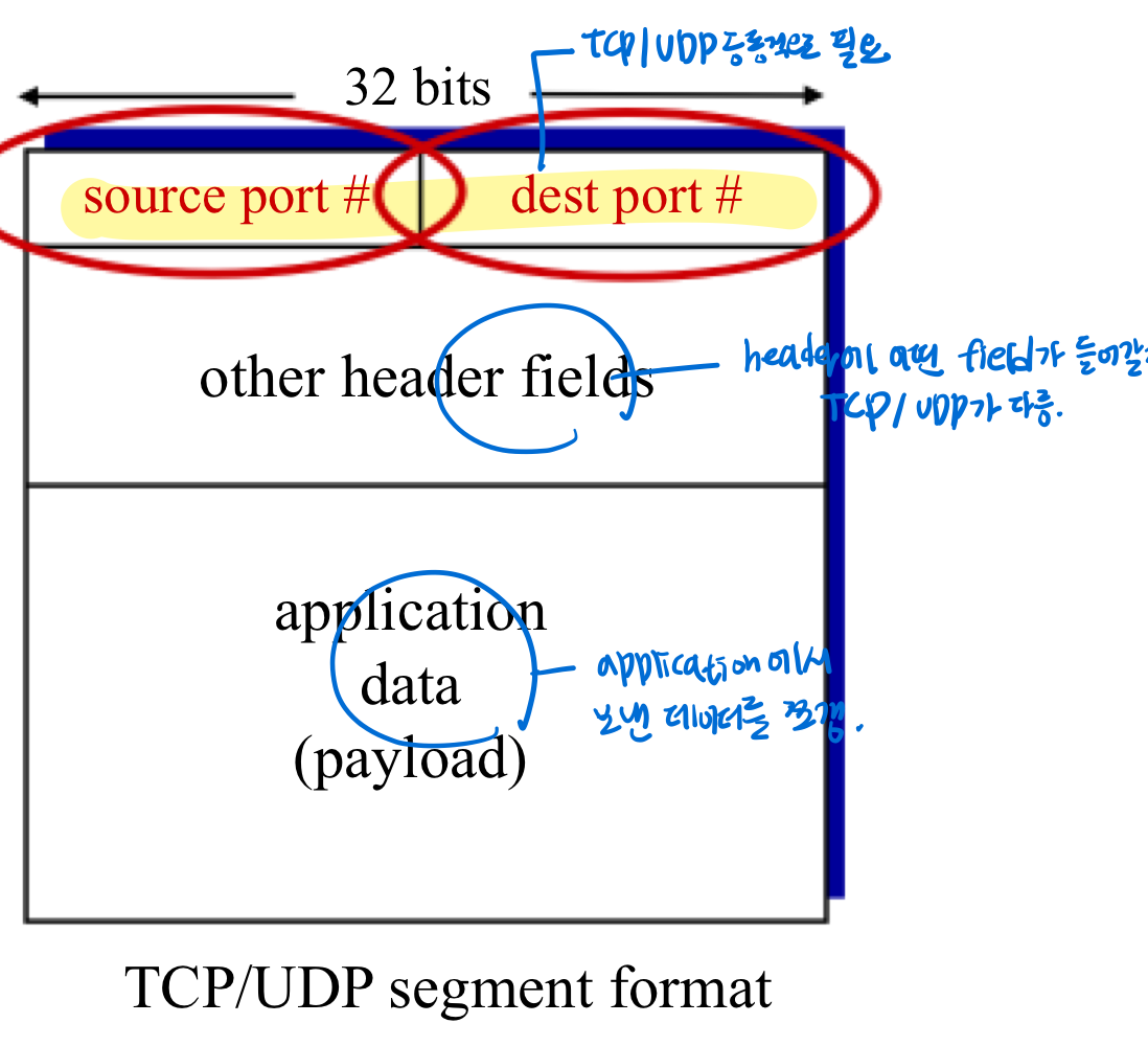 - Multiplexing과 demultiplexing은 각각 segment, datagram 헤더 값들에 기초