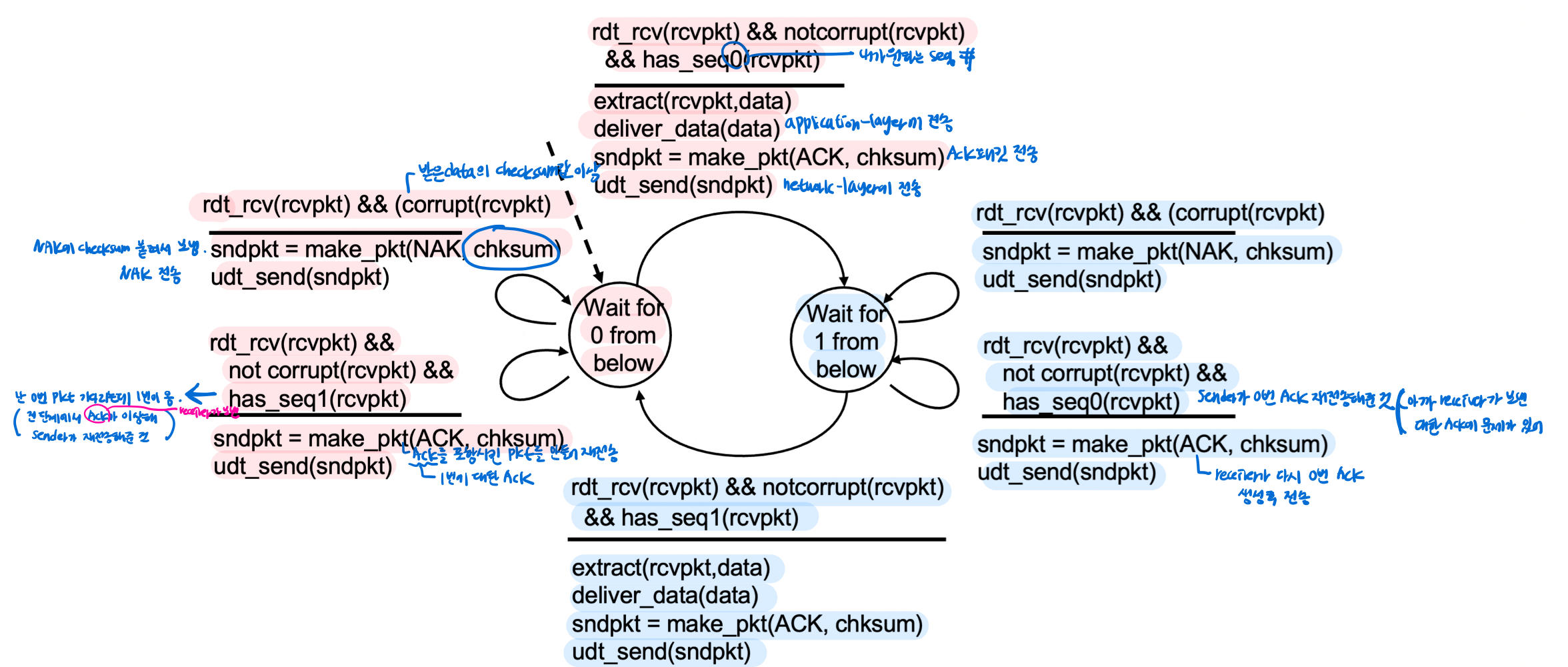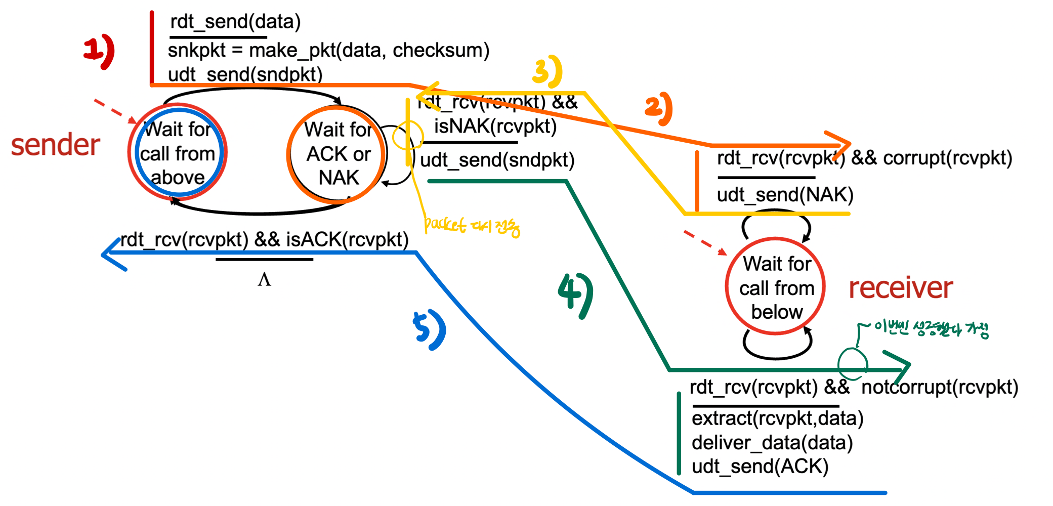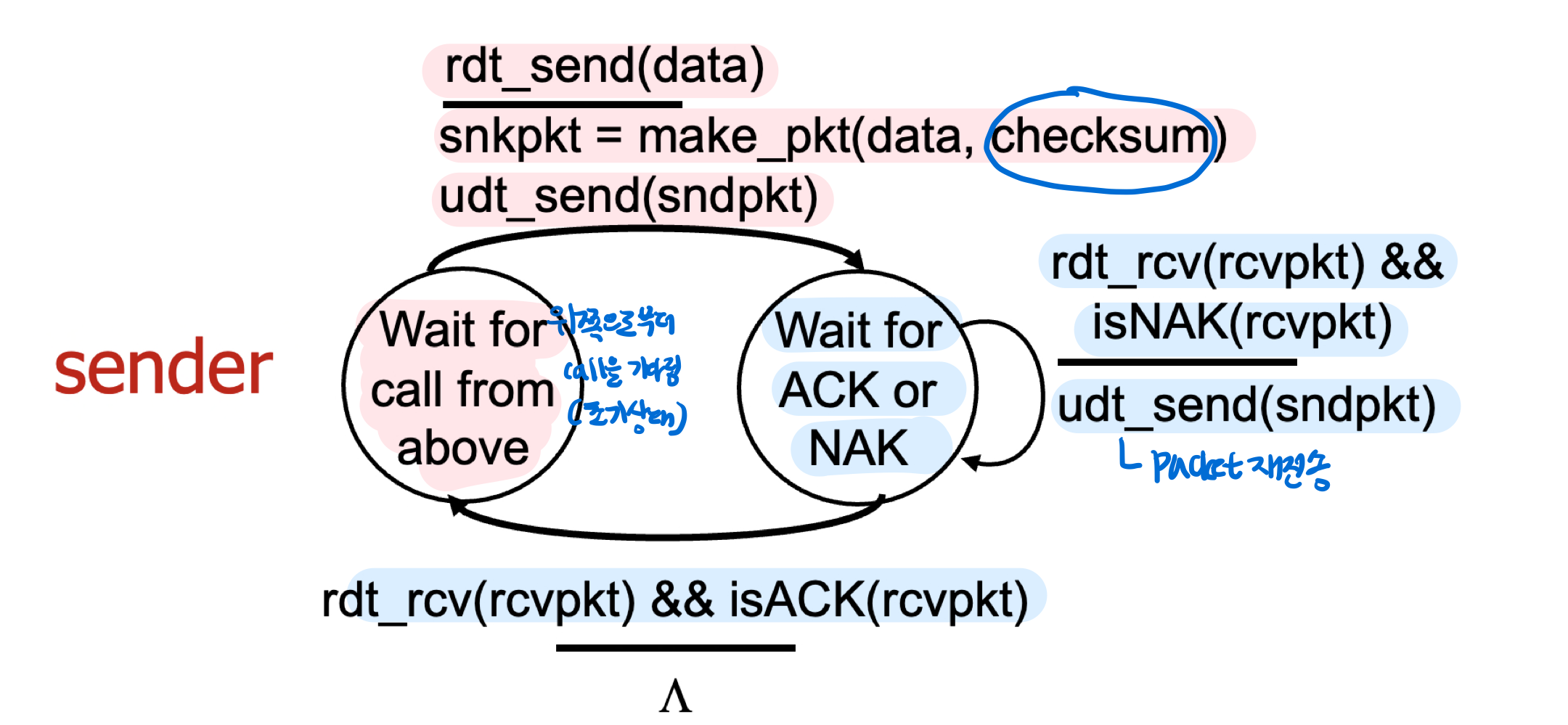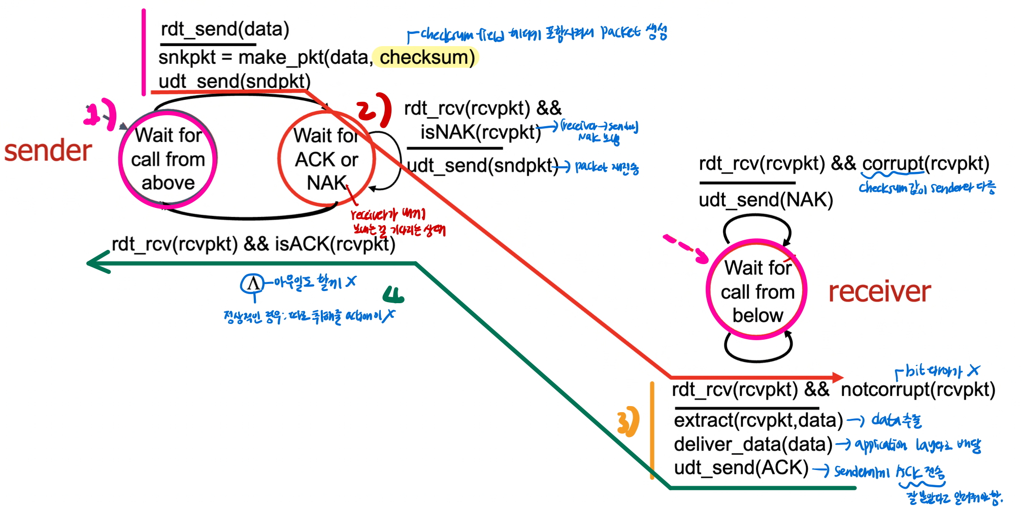 - rdt 2.0과 다르게 receiver는 ACK/NAK를 보낼 때에도 checksum 값을 붙혀서 보내야 한다.