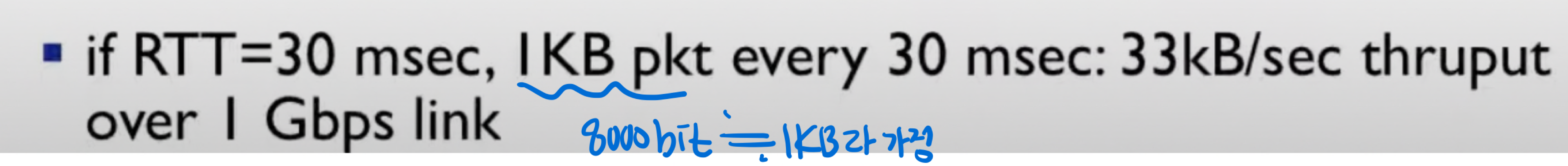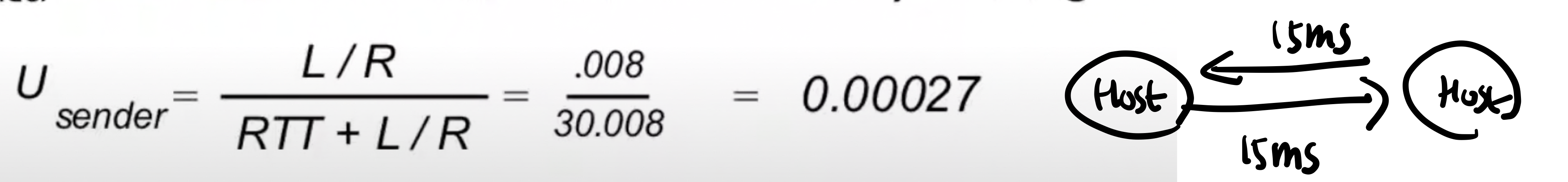 - > 우리는 packet size가 8000bit(대략 1KB라 가정)인 packet을 보낼 때, 30.008msec가 듦. -> 33KB/1sec --> 내가 가진 link의 bandwidth는 1Gbps인데, 1초에 33KB밖에 못보내므로 낭비가 심함. -> network protocol(rdt 3.0)이 물리적인 자원(link)의 사용을 제한하고있음.