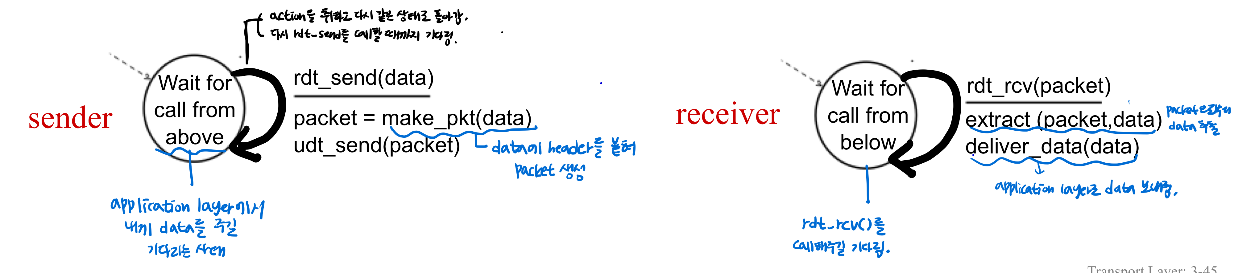 - sender (in application layer): segment 단위로 application message들을 쪼개서, network layer로 전송