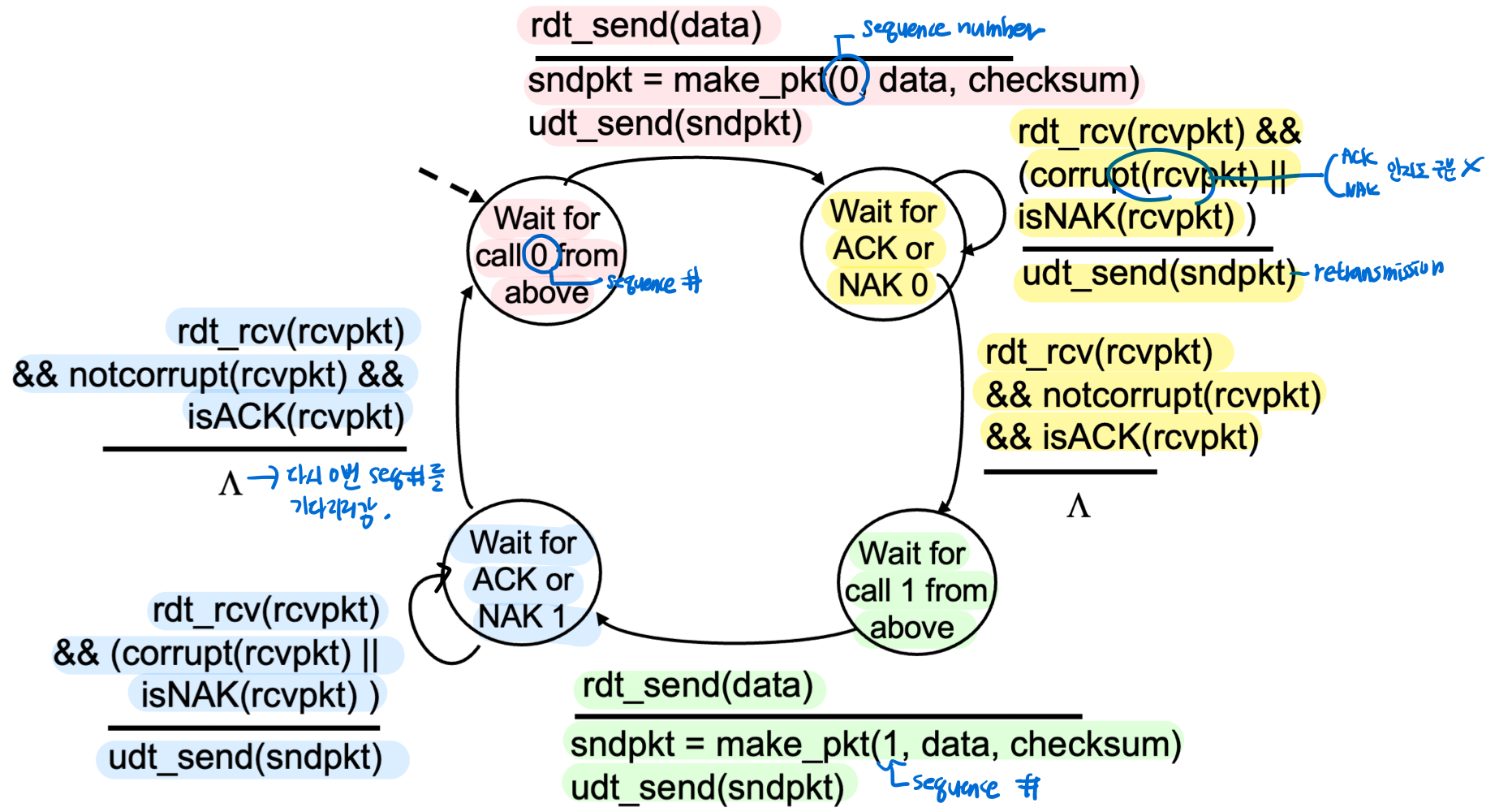- 만약 ACK/NAK에 bit error가 나면 sender는 현재 packet 재전송 필요- sender는 각 packet에 sequence number 추가