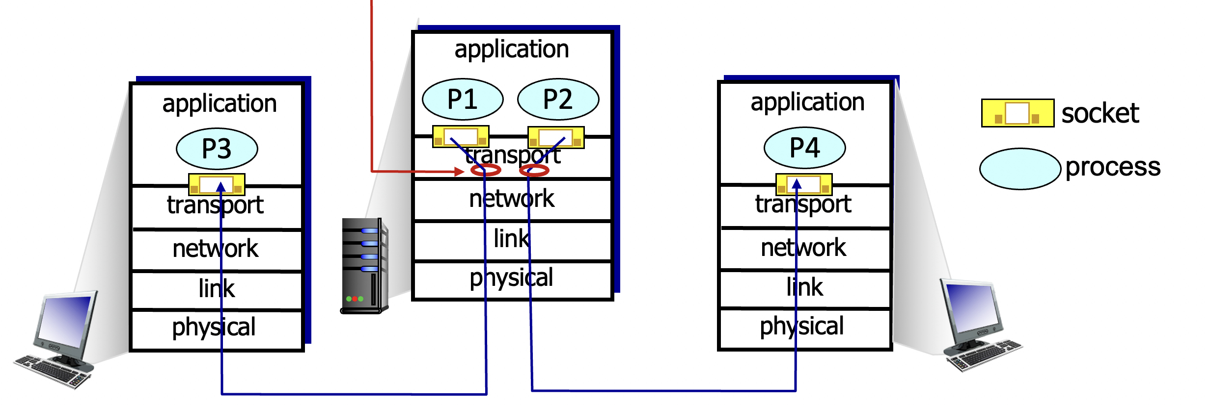 multiplexing at sender : 여러개의 소캣(각각의 프로세스가 생성한)으로부터 데이터(segment)를 받아, transport 헤더를 추가(나중에 demultiplexing에서 사용)
