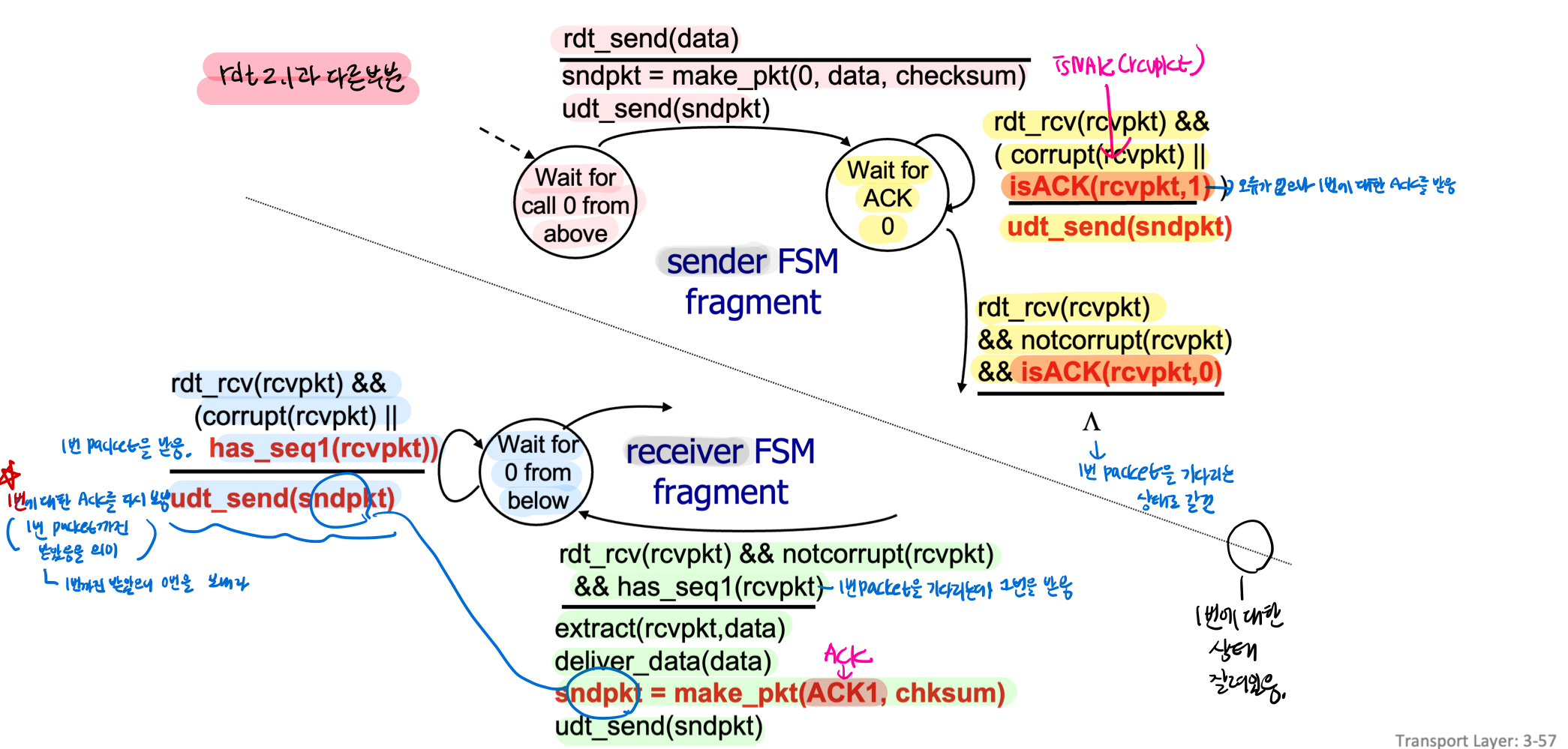 - rdt 2.1과는 다르게 receiver쪽에서 ACK를 보낼 때 어떤 seq #의 packet인지 명시 필요