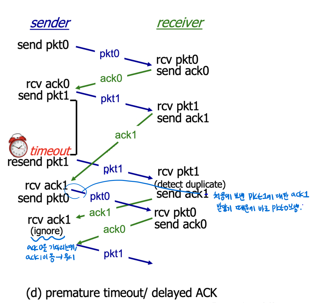 - receiver 입장에선 time out에 의해 재전송된 패킷인지, ACK에서 corrupt가 일어나 재전송된 패킷인지 구분할 필요 X