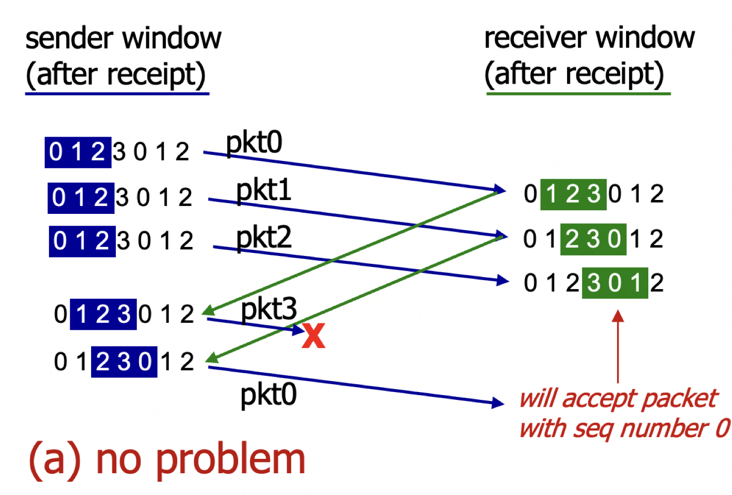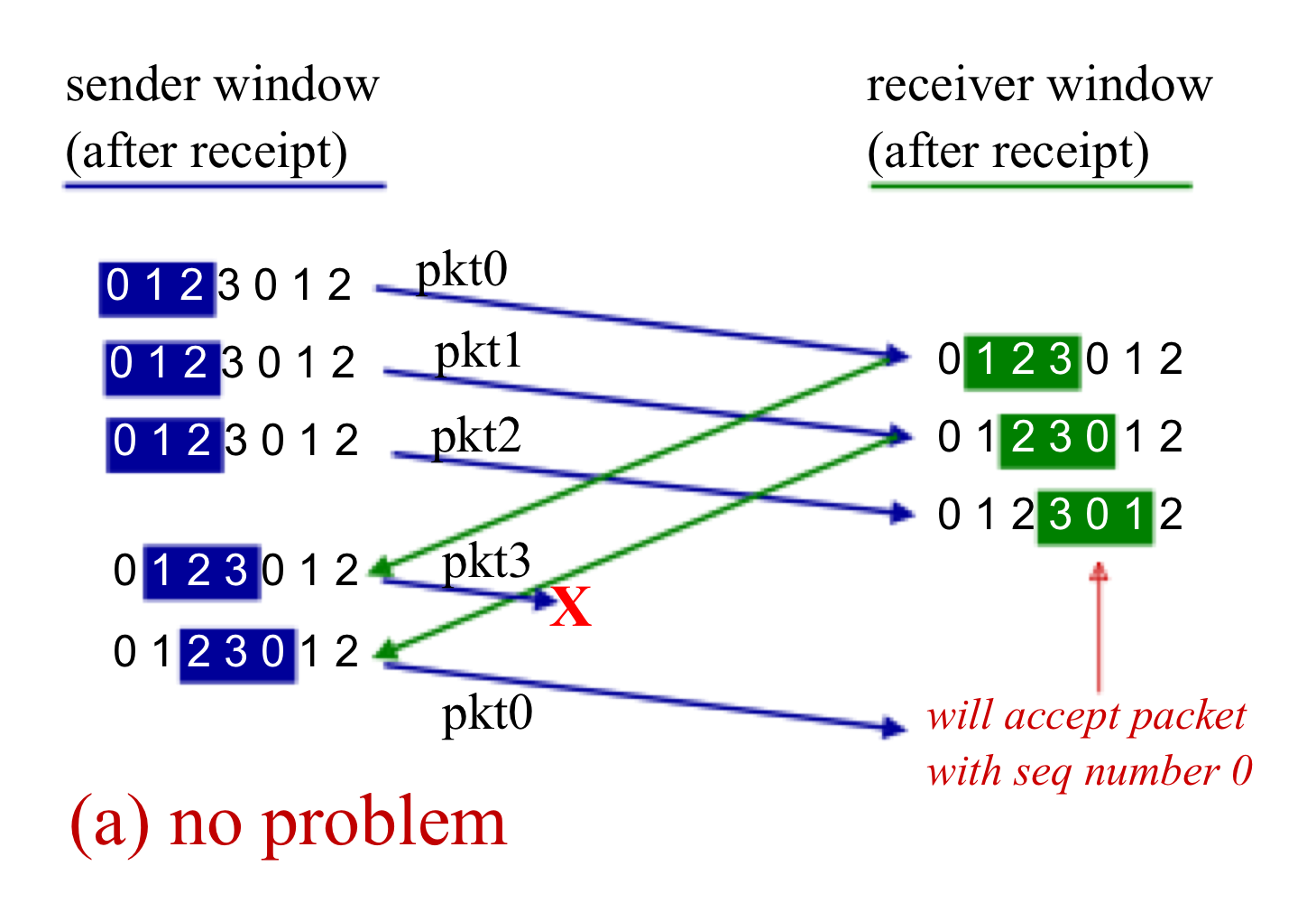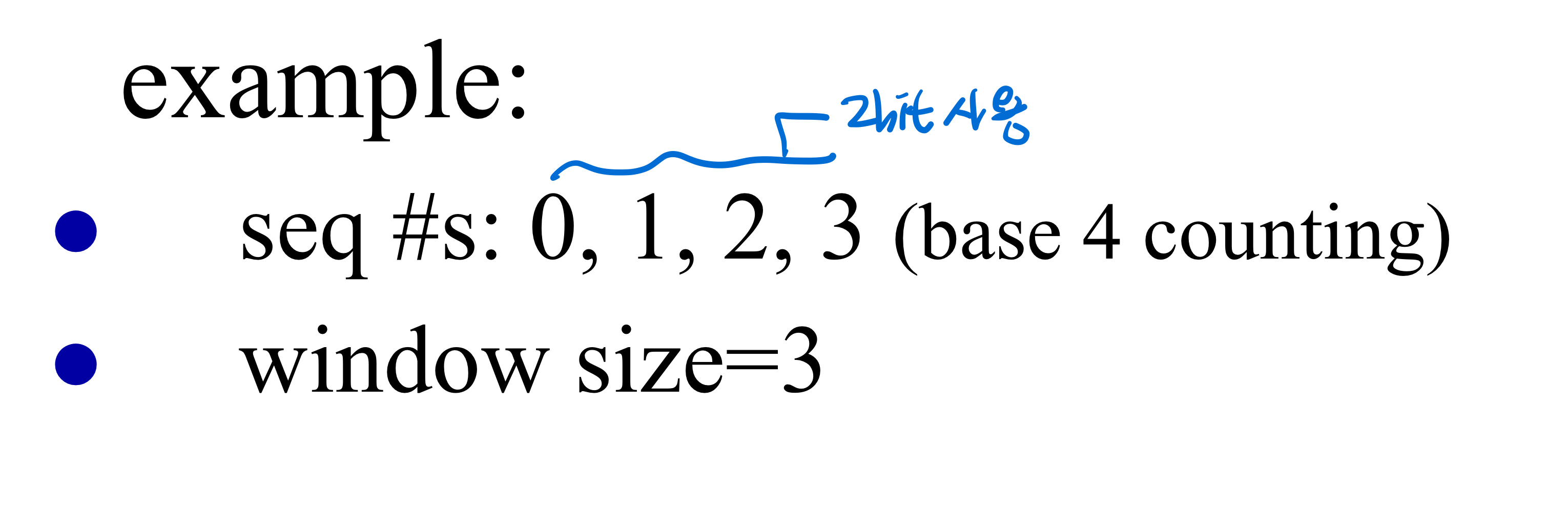 - 위의 상황에서 seq # size >= 6 → 적어도 seq # (0,1,2,3,4,5)를 가져야함. → seq # 3bit 필요