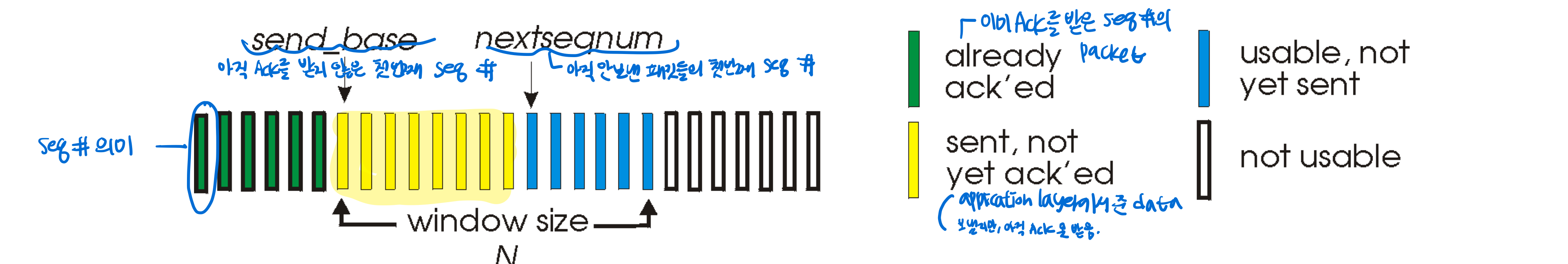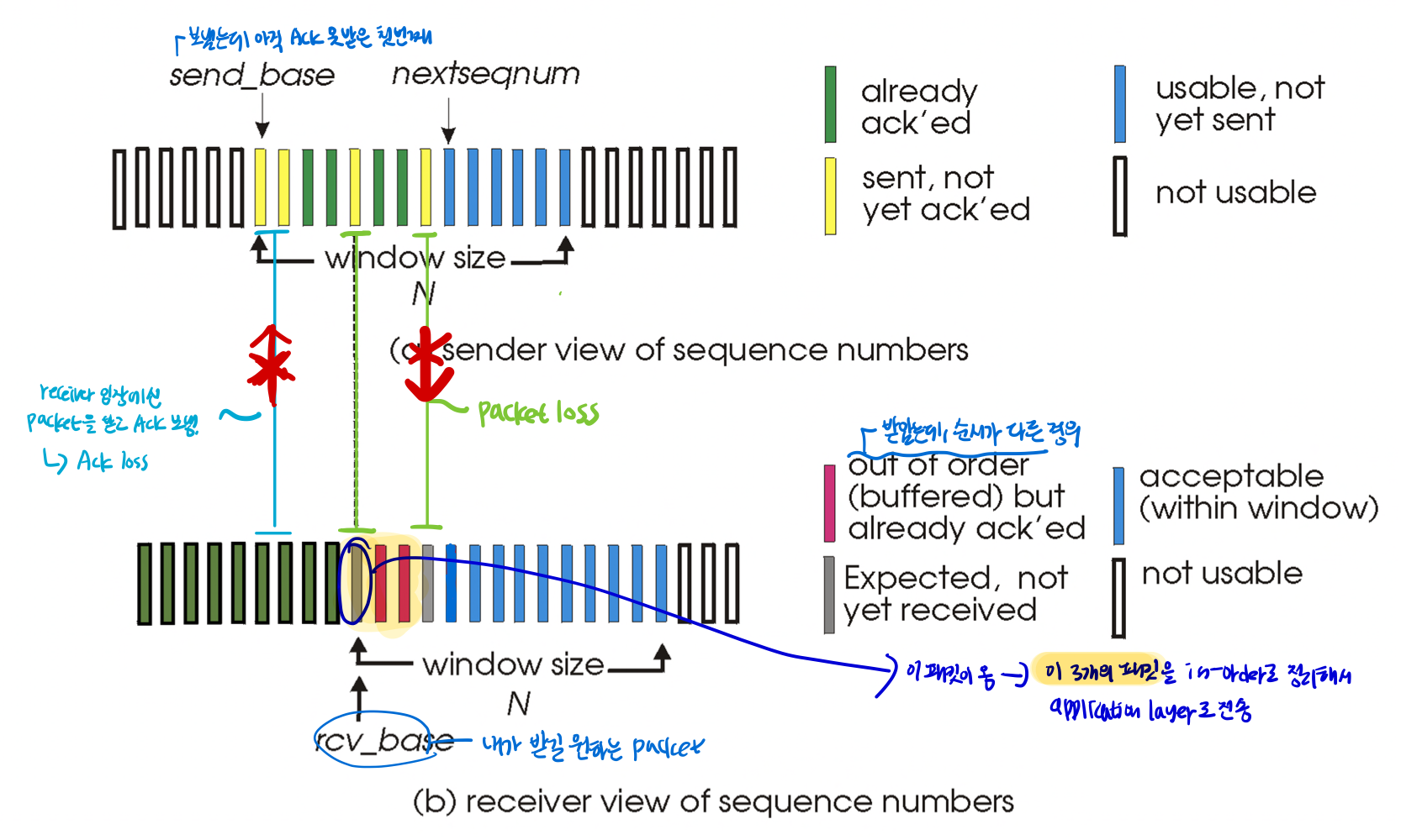 - 항상 send_base는 노란색 (ACK를 받았다면 윈도우가 이동할 것이므로)