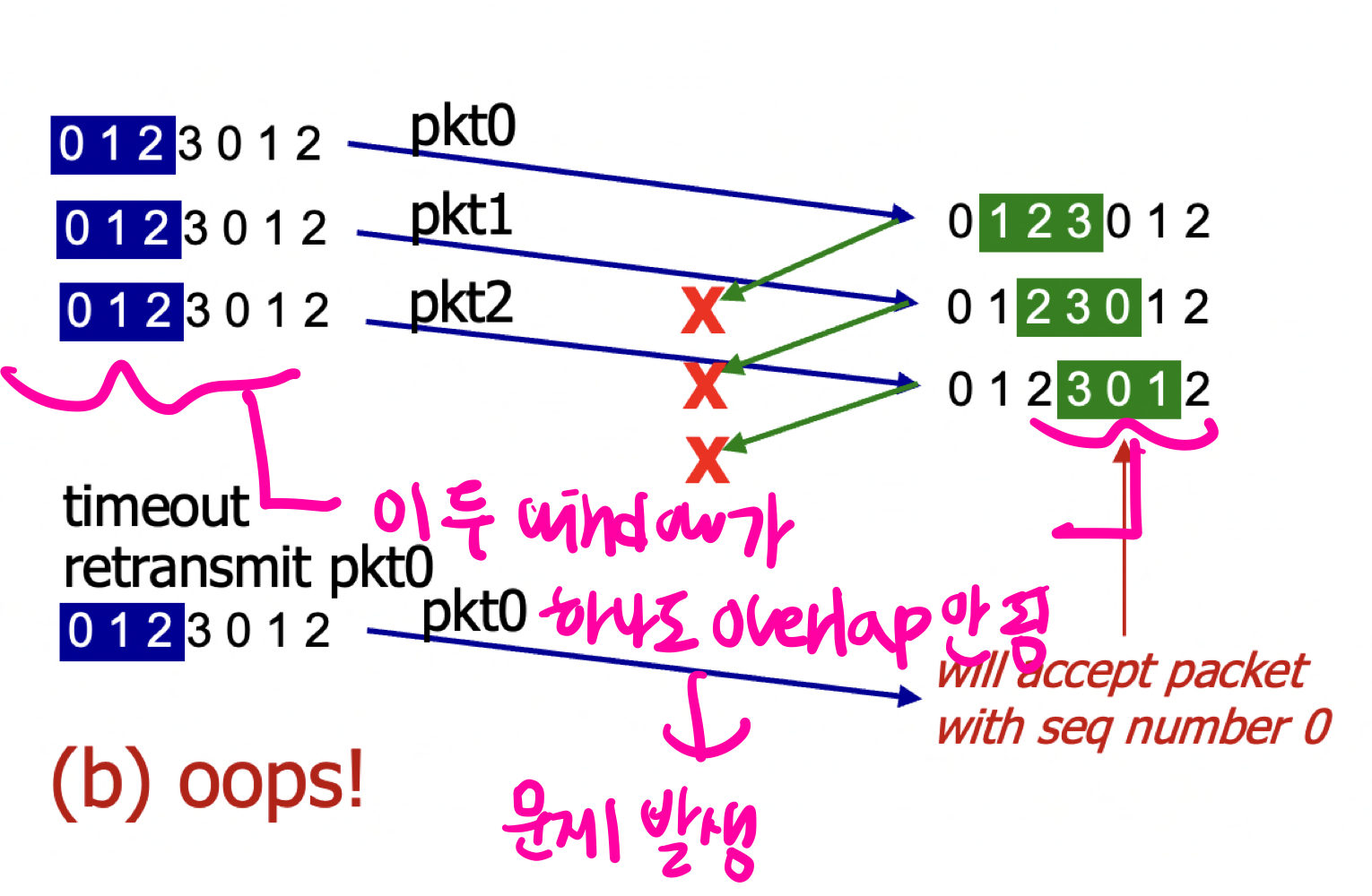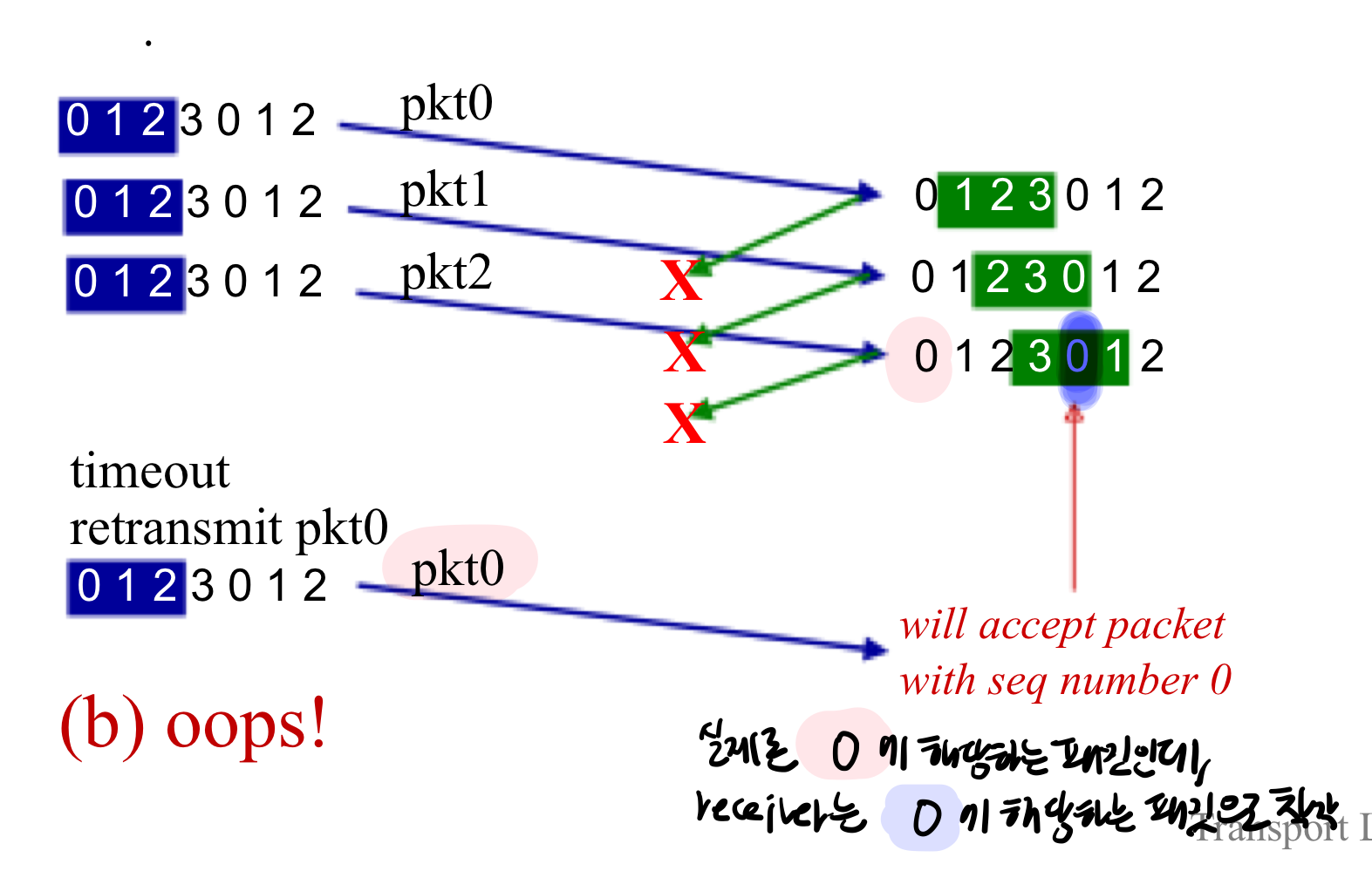 (b) window size=3 && 3번 Ack loss가 발생한 경우 -> seq # size && window size가 문제 발생시킴!