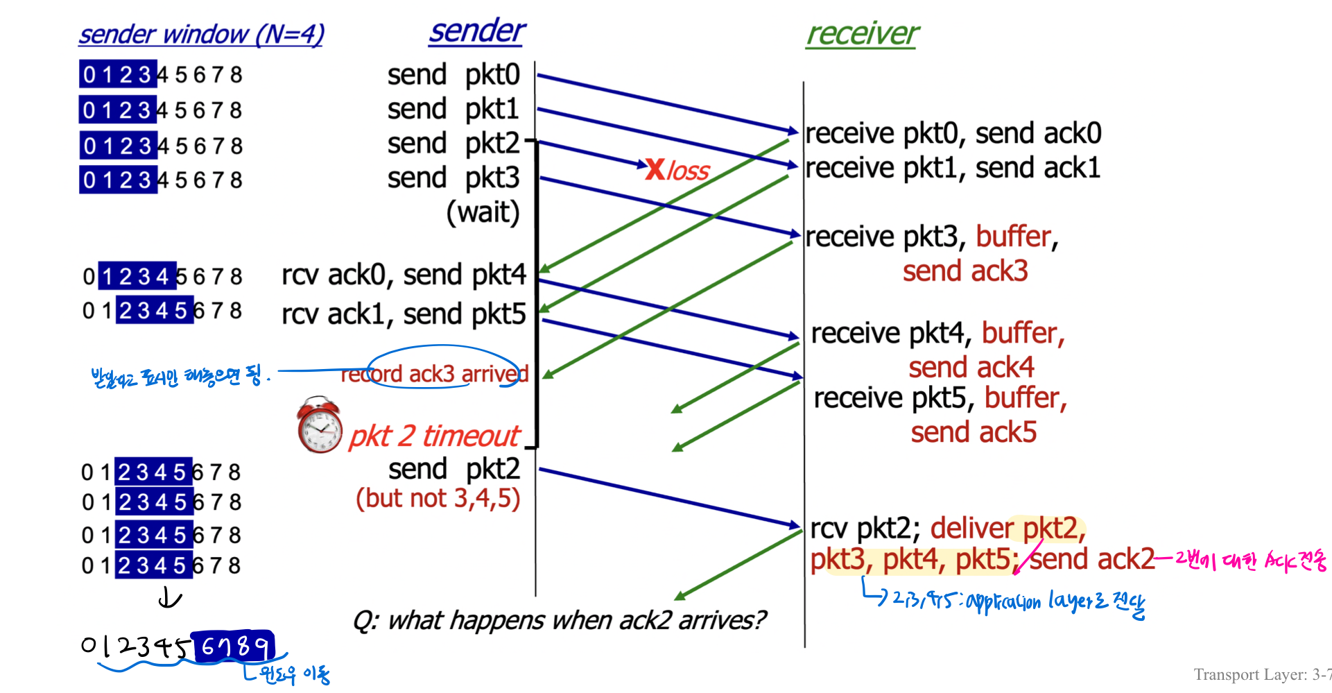- n번 패킷은 [rcvbase, rcvbase+N-1] 안에 존재 -> Ack(n) 전송