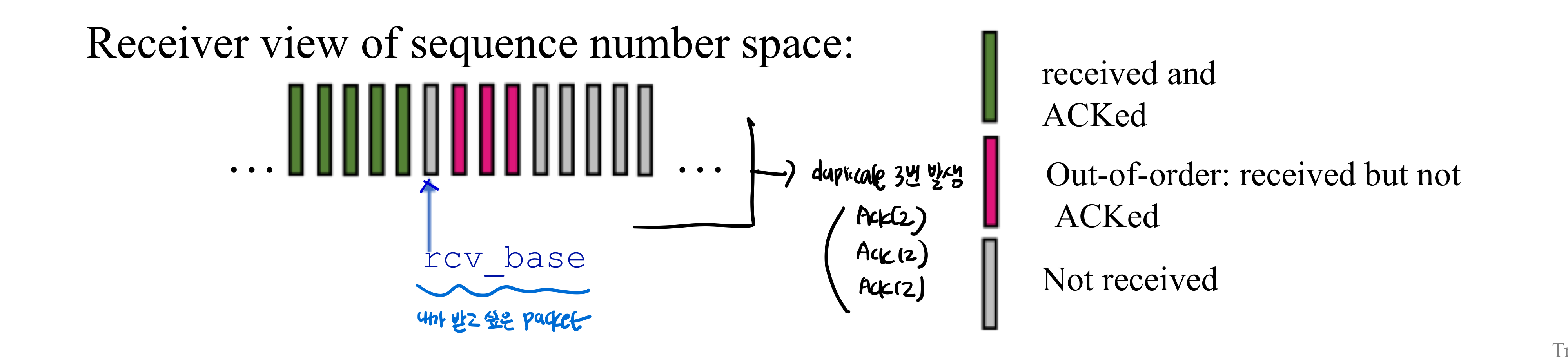 - 정상적인 경우(rcv_base에 해당하는 패킷이옴): 전달 (버퍼에 저장된 패킷과 함께 in-order로 정리해서 전달), recv_base 이동