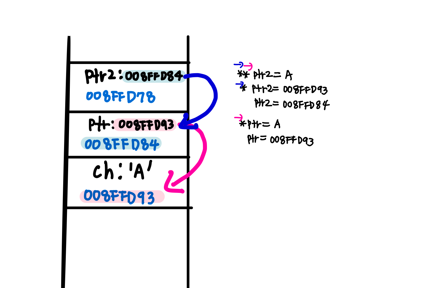 char 변수 ch의 주소값을 포인터 변수 ptr이 참조하고 있고, 이 ptr 포인터 변수의 주소값을 또 다시 이중 포인터 ptr2가 참조하고 있다. 따라서 이중 포인터에서 이를 역참조하면 char 변수 ch까지 접근 가능하다.