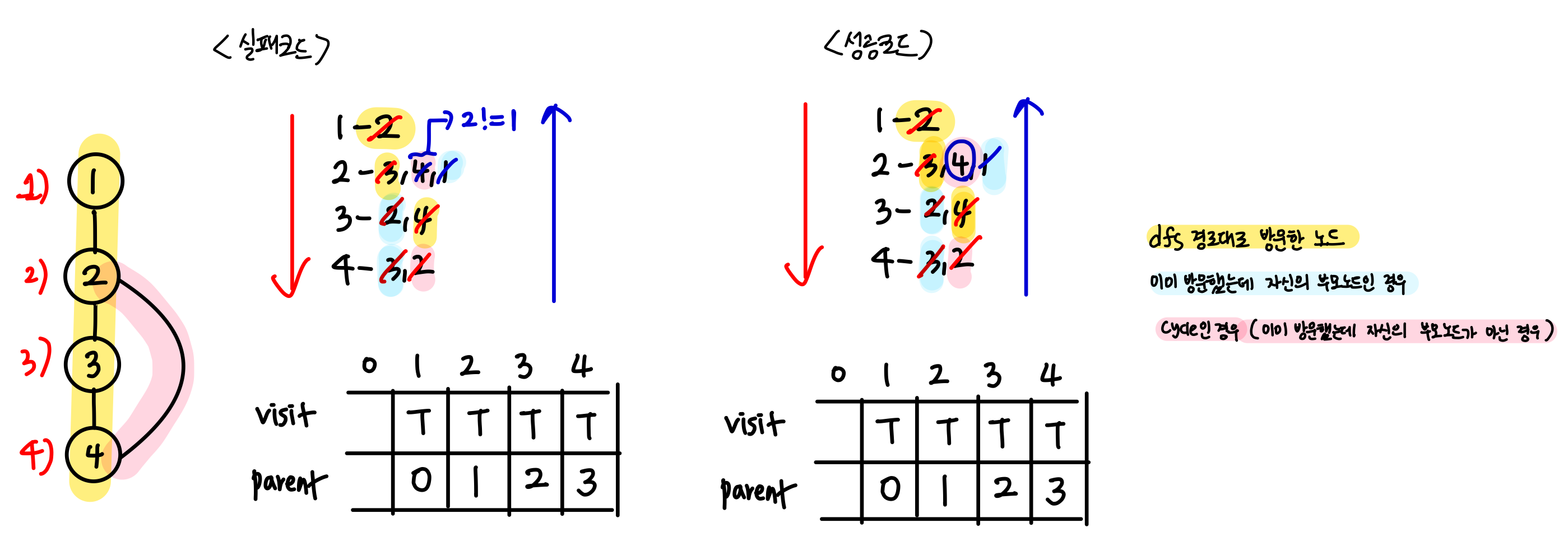좀 더 자세히 얘기해보자면 x가 해당 노드고, i가 인접한 노드를 나타내는데 <실패코드>에서는 이 i를 0이 아닌 최상위부모까지 올라간 뒤 x와 비교한다. <성공코드>에서는 while문을 돌며 i를 부모노드의 값으로 치환하고 while문 안에서 x값과 i값(치환된 부모노드값)을 비교하며 같을 시에는 사이클이라고 판별한다.