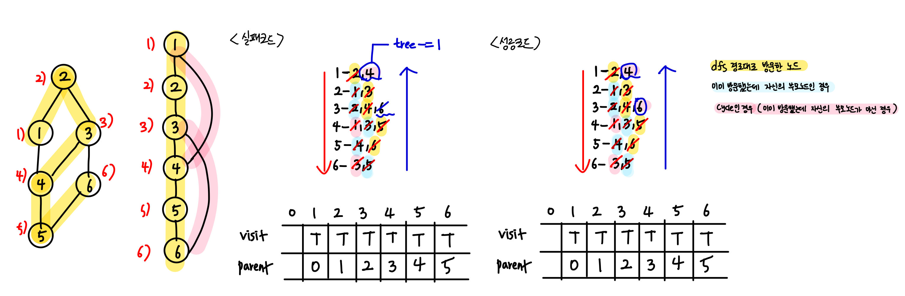 결과적으로 <실패코드>와 <성공코드> 모두 정답은 맞게 나오지만(No trees.), 자세히 들여다보면 <실패코드>에서는 cycle 하나를 발견 못한다.