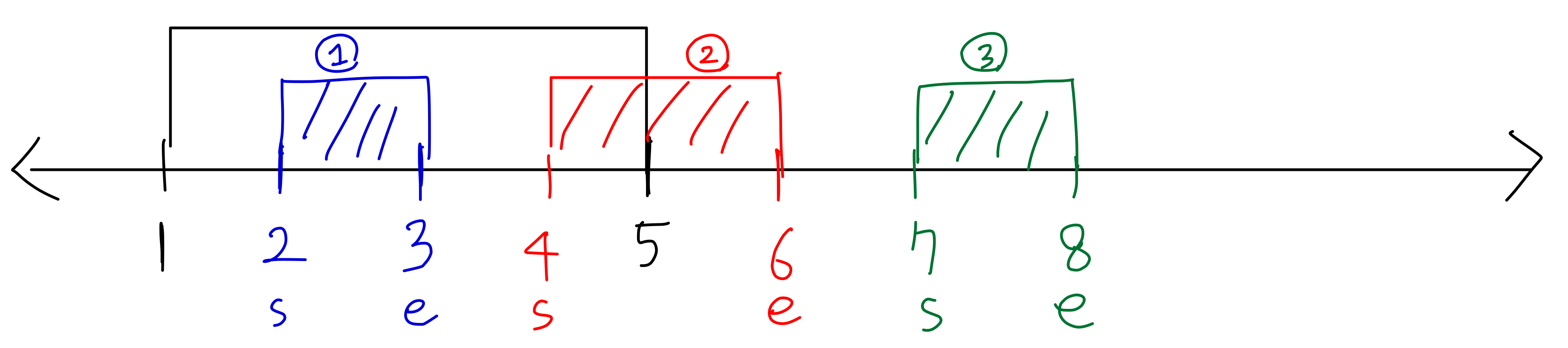 + 우리는 line 배열을 첫번째 값인 start 기준으로 정렬해서 사용(같다면 두번째 값인 end 기준으로 정렬)하기 때문에 다음과 같은 경우는 고려할 필요가 없다.