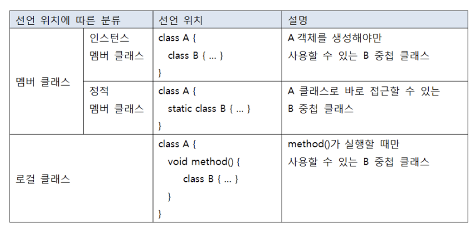- 로컬 클래스 : 메소드 내부에서 선언되는 중첩 클래스